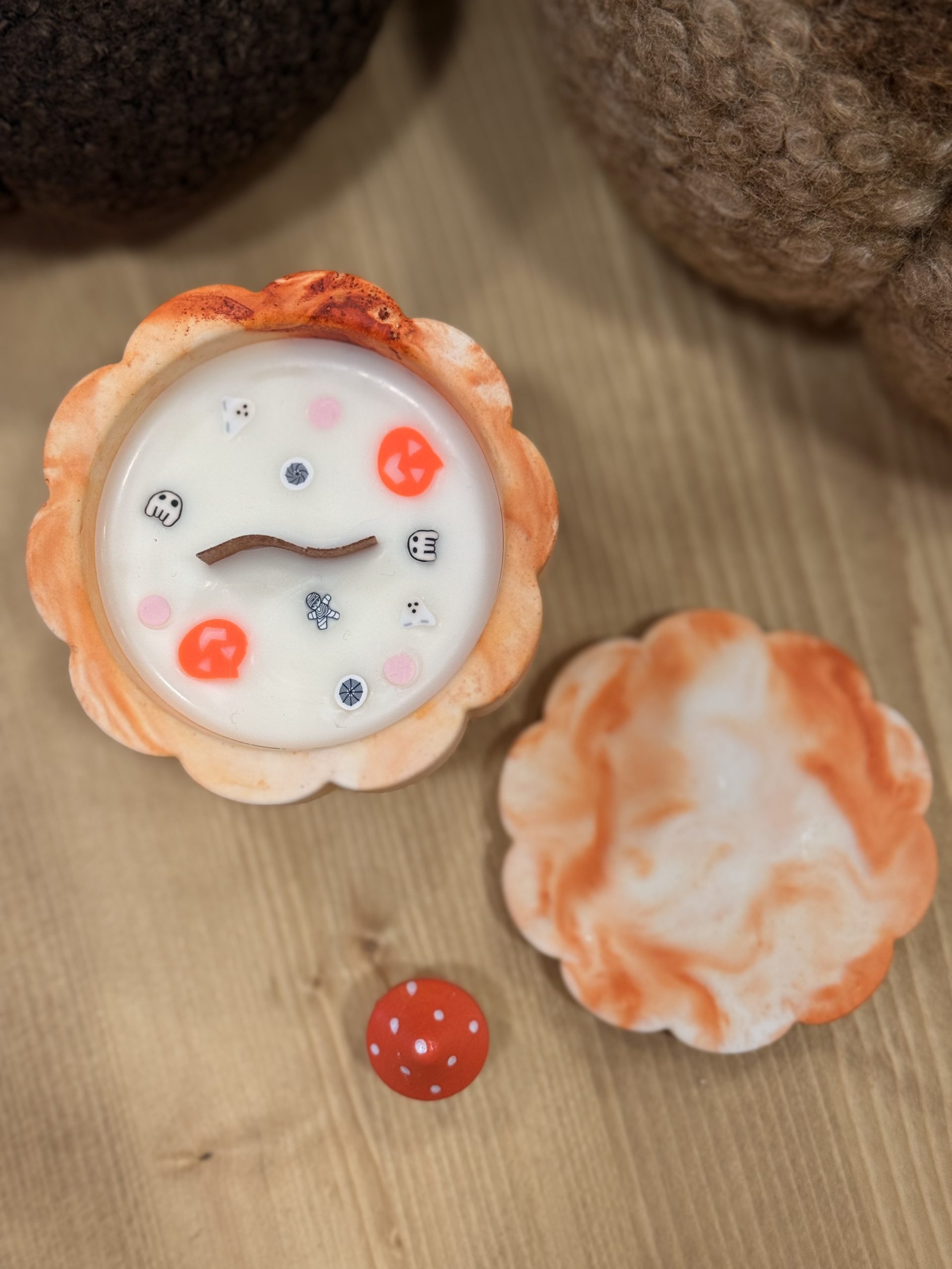 Aroma a calabaza dulce y notas cálidas de otoño. Recipiente artesanal en tonos naranjas con decoración de Halloween. Te conectará con la energía de la temporada.