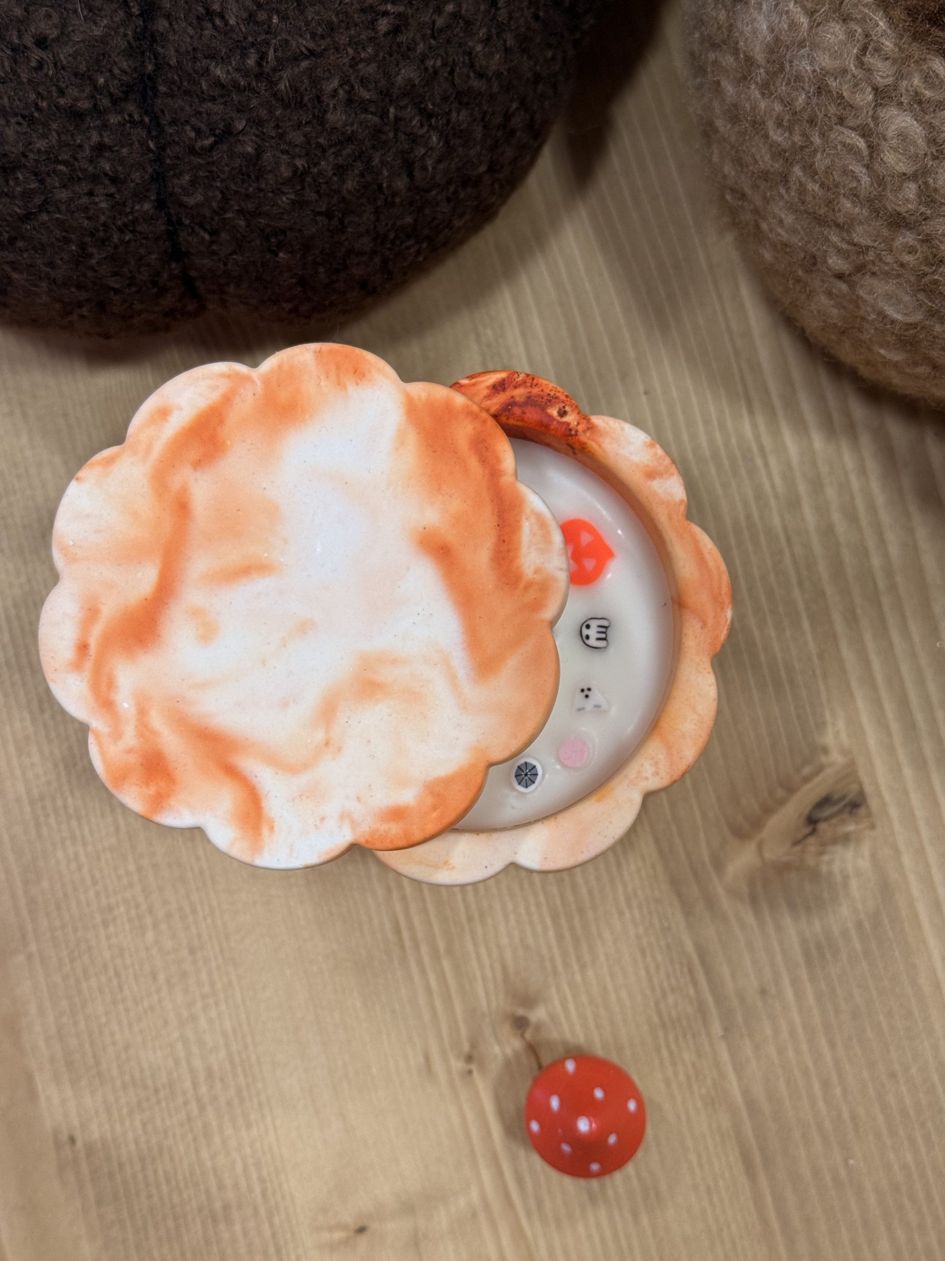 El recipiente, elaborado a mano con resina ecológica, presenta tonalidades naranjas que varían ligeramente en cada pieza, haciendo que ninguna sea igual a otra.