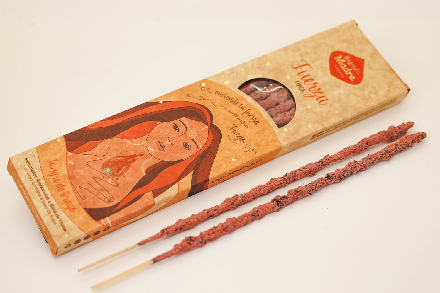 Incienso Artesanal Fruit Base: 6 varillas de 1 hora, elaboradas a mano con aceite concentrado de sangre de dragón, biomasa de frutas, carbón vegetal, aglutinante natural y sal, para encender tu fuerza y protección.